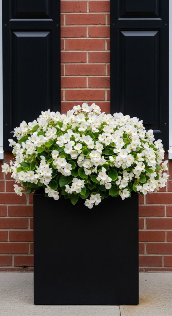 Begonias provide reliable color in shade or sun. Buy 5-7 white begonias ($3-5 each) for a clean, classic look. They bloom continuously without deadheading. Begonias tolerate more drought than impatiens but appreciate regular water. The waxy leaves resist pests and diseases. White varieties brighten dark corners and glow in evening light. Feed monthly with balanced fertilizer. These plants stay compact and tidy all season. Dig up tubers before frost to save for next year.