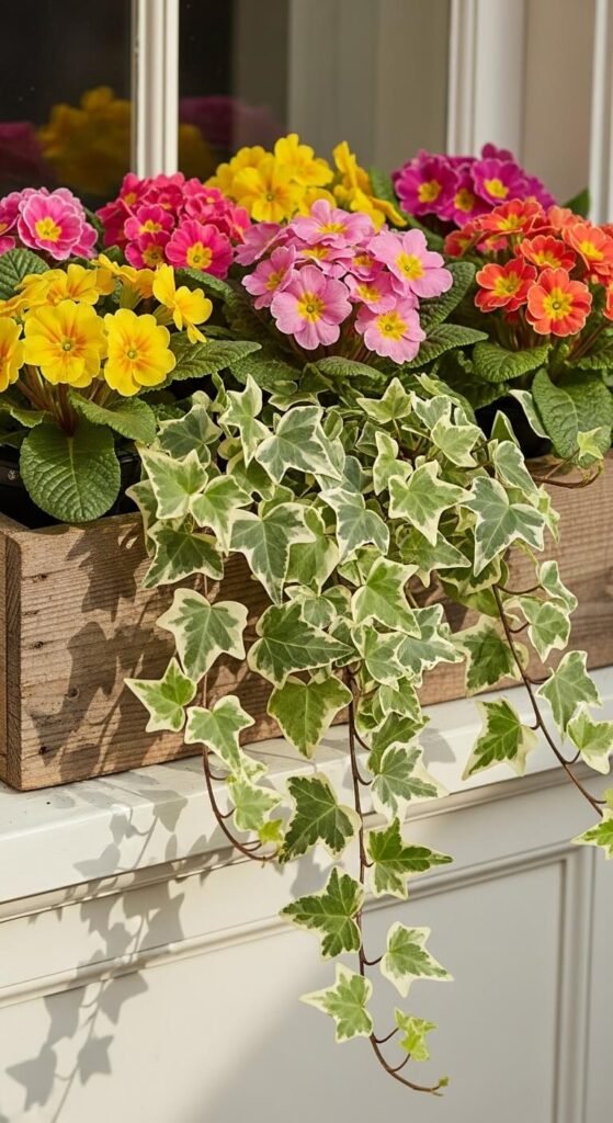 English ivy costs $4-6 per pot and lasts all season. Primroses add pops of color for $3-4 each. Plant three primroses in the center, then tuck ivy along both ends. The ivy grows fast and creates a lush, flowing effect within weeks. Primroses prefer cooler weather and bloom heavily in spring. Pinch off dead flowers to encourage more blooms. This combination needs regular watering but tolerates some neglect.