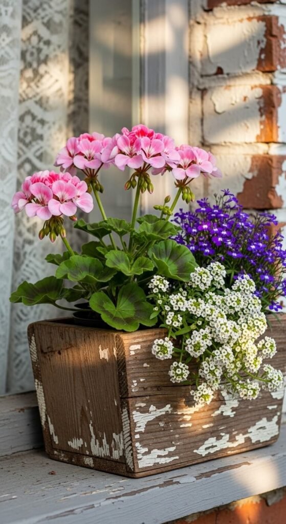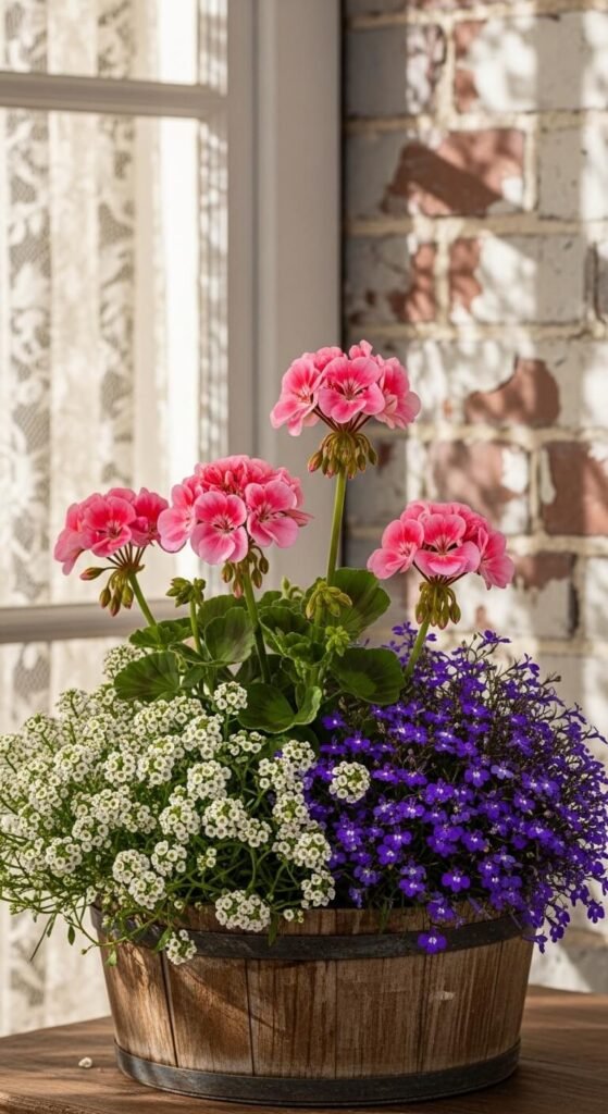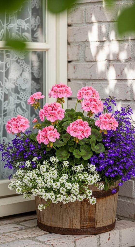 Combine geraniums, alyssum, and lobelia for a dreamy cottage feel. Geraniums provide structure at $5-7 per plant. Alyssum creates a fragrant carpet underneath for $3-4. Trailing lobelia adds cascading color for another $3-4. Space plants 6-8 inches apart. This trio tolerates heat better than many spring flowers. Deadhead geraniums weekly. Water deeply but let soil dry slightly between waterings. The alyssum self-seeds and may return next year.