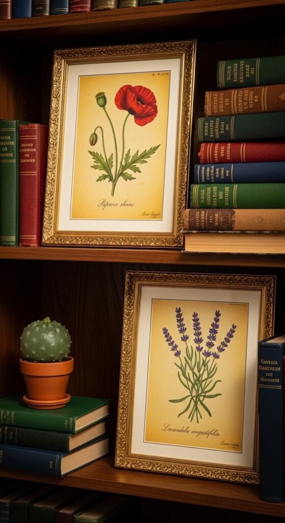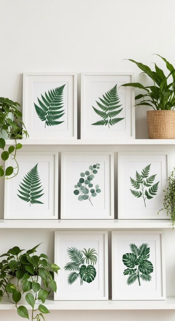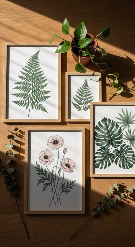 One often-overlooked idea: rotate your botanical prints by season. Spring: cherry blossoms and tulips. Summer: sunflowers and lavender. Autumn: maple leaves and acorns. Winter: pine branches and holly. Buy several sets of digital prints and swap them out every few months using the same frames. It costs almost nothing and keeps your walls feeling current and connected to what’s happening outside. Store the off-season prints flat in a large portfolio folder between rotations.