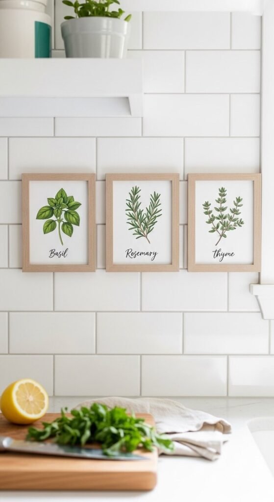 Kitchen walls are often overlooked — and herb prints are made for them. Basil, rosemary, thyme, oregano, and mint illustrations look charming and relevant in a cooking space. Prints with the plant name written in a clean font add a practical, apothecary feel. You can find sets of six herb prints as digital downloads for around $5-8 on Etsy. Print, frame, and hang above the stove or along the backsplash. Simple, affordable, and genuinely useful-looking.