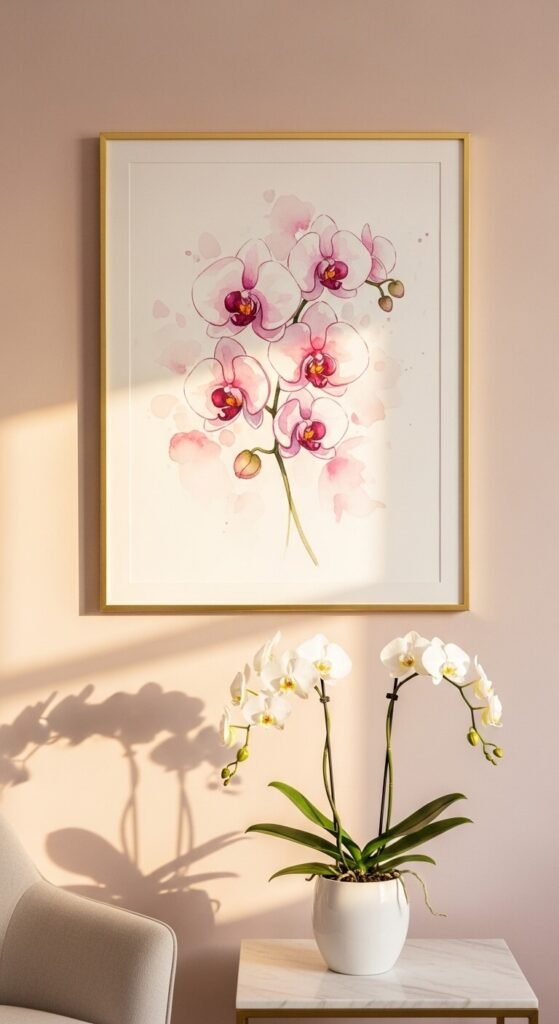 Orchid prints carry a certain quiet sophistication. Loose watercolor orchids on blush or cream paper feel both feminine and refined without being fussy. These work well in formal sitting rooms, master bedrooms, and powder rooms. Look for prints where the brushwork is relaxed rather than stiff — that’s what gives them their soft, natural energy. A thin gold or brass frame completes the look perfectly. You can find beautiful options on Etsy from $8-15 as downloads.