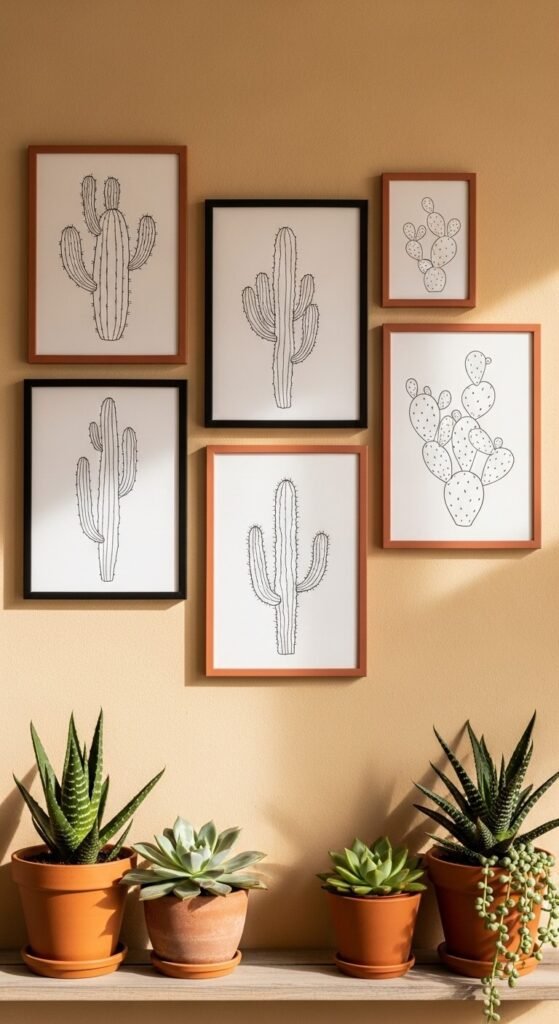 Cactus prints have a cool, laid-back energy that fits modern desert-inspired interiors perfectly. Clean line-art style — no color, just black ink on white — looks especially sharp and graphic. Mix a few different species: saguaro, prickly pear, echeveria, aloe. A loose cluster arrangement on the wall (rather than a perfect grid) feels more casual and collected. Combine them with real succulent plants on a nearby shelf to tie the whole vibe together.