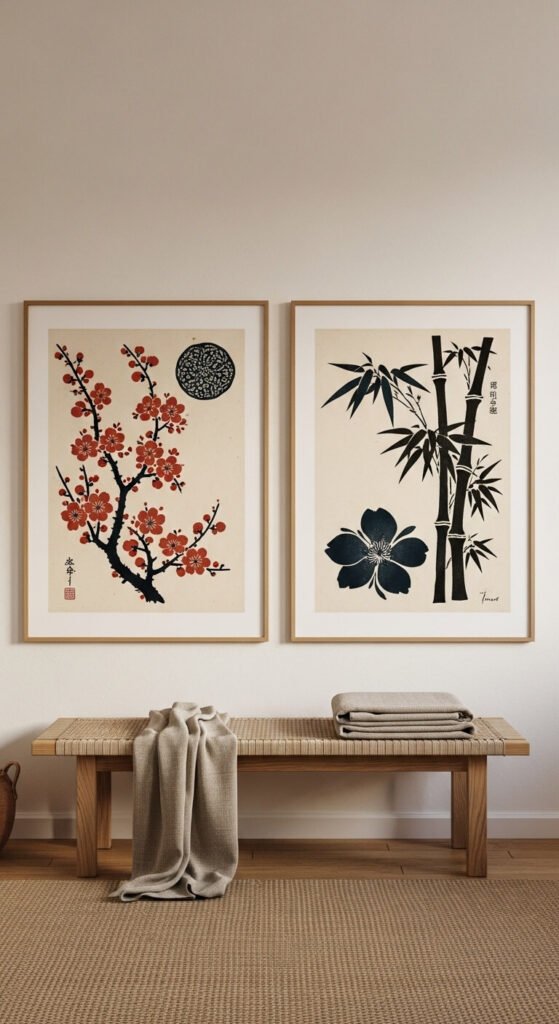 Japanese botanical woodblock prints bring a meditative, artistic quality that few other styles can match. The bold ink lines, flat color areas, and asymmetric compositions give them visual strength without noise. Cherry blossom, bamboo, lotus, and pine are classic subjects. Look for prints that reference the ukiyo-e tradition. These work well in minimal interiors with natural wood, linen, and neutral tones. They’re also available as free downloads through many museum digital archives.