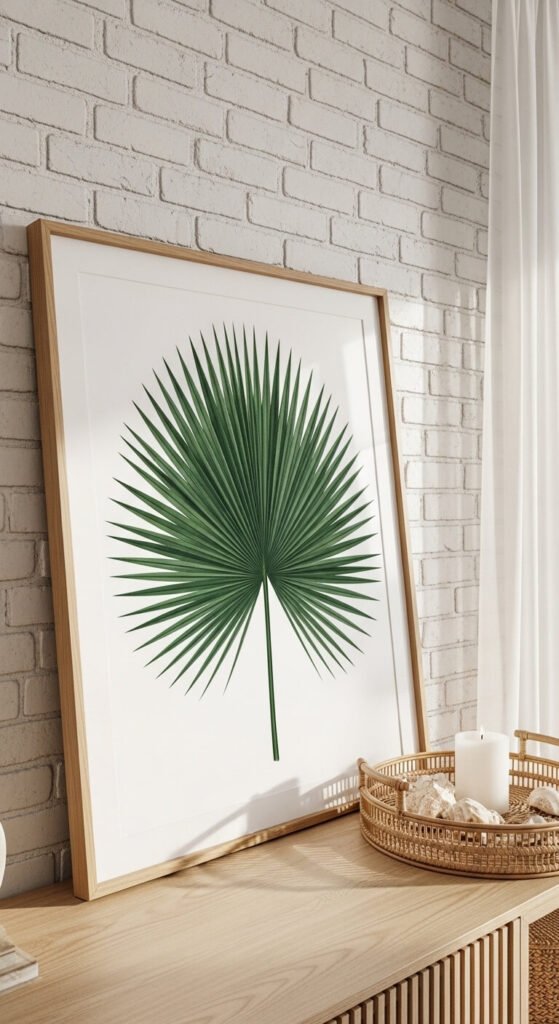 Palm leaf prints bring that easy, breezy coastal feeling indoors without any kitsch. A large fan palm or coconut palm illustration printed at 18×24 makes a real impact. Keep the framing simple — natural wood or white frames let the botanical illustration breathe. These work well in living rooms, sunrooms, or anywhere you want to channel that relaxed, sun-drenched energy. Lean larger prints against the wall rather than hanging them for a more relaxed, layered look.
