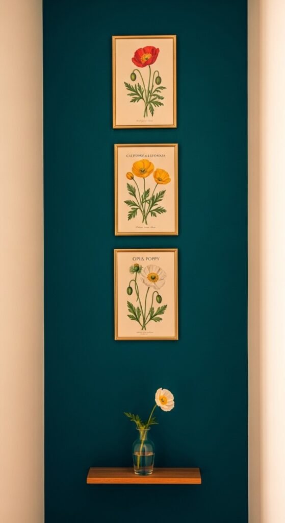 Poppies are one of the most painterly botanical subjects — those tissue-paper petals and elegant stems are made for illustration. Watercolor poppy prints in red, orange, or blush add genuine color to a space without feeling loud. Hang them on a deep-toned wall like teal, charcoal, or navy to make the colors really sing. A vertical column of three small prints in a hallway is one of the most impactful and space-efficient ways to display them.