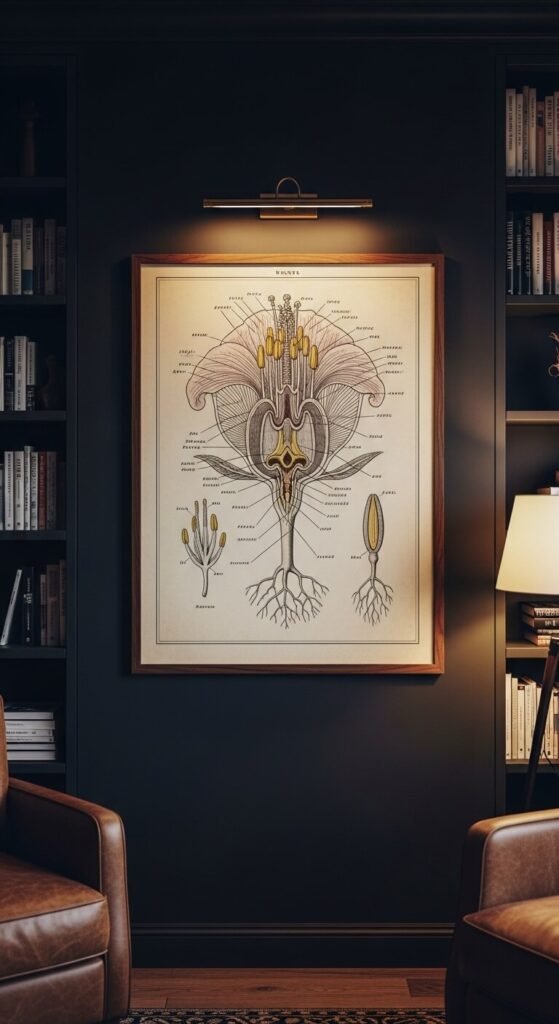 These are for the true plant nerds — and they’re genuinely beautiful. Cross-section diagrams of flowers, seed pods, and root systems are fascinating to look at up close. The intricate linework and scientific labeling give walls a thoughtful, intellectual quality. Look for vintage botany textbook illustrations from the 1800s — many are free through university digital library archives. These are perfect for home offices, libraries, and studies. Frame them large for maximum visual payoff.