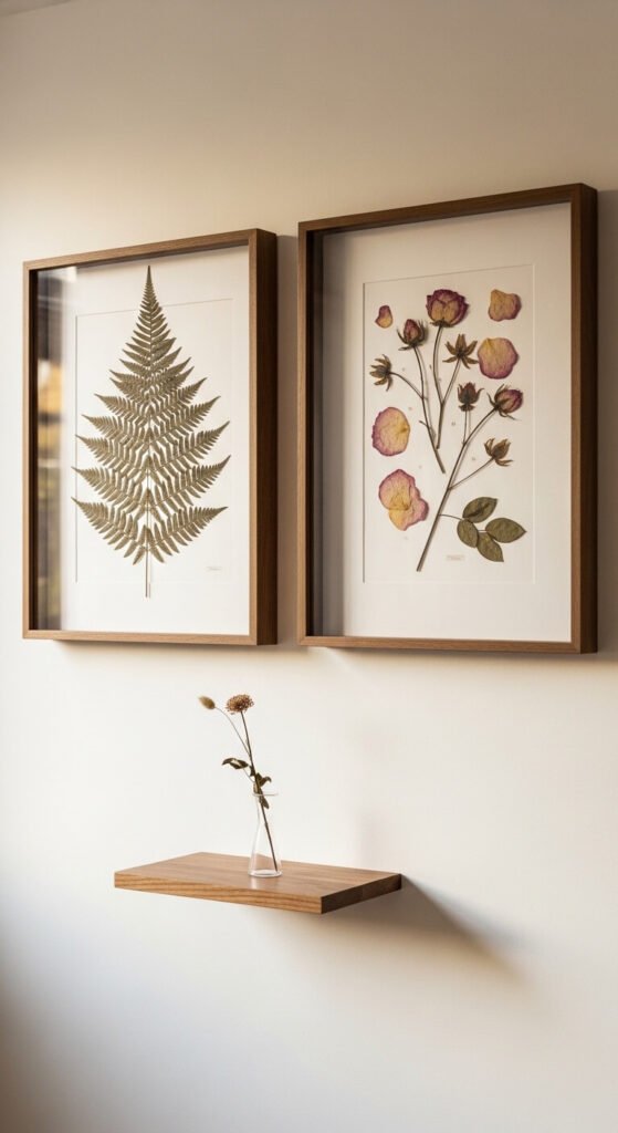 Shadow box frames take botanical art into three dimensions. Instead of a printed illustration, you’re displaying real dried botanical specimens behind glass. Pressed ferns, seed pods, dried flowers, and bark pieces all work beautifully. Arrange them on white or black mat board inside a deep frame. The specimens cast actual shadows, creating incredible texture and depth. These are perfect for large walls that need something with real physical presence. IKEA Ribba deep frames are perfect for this under $20.