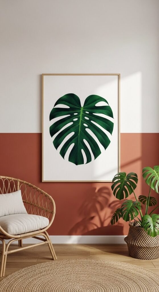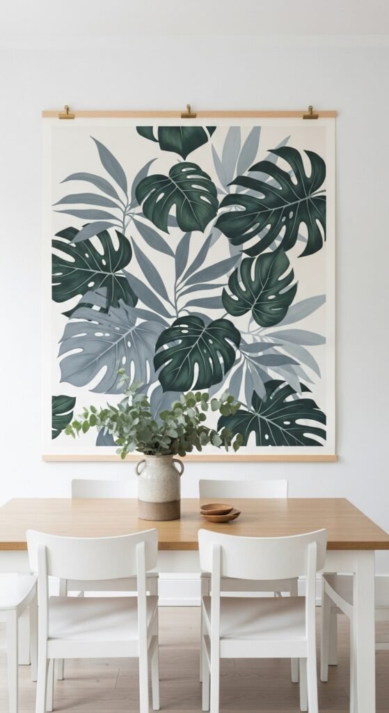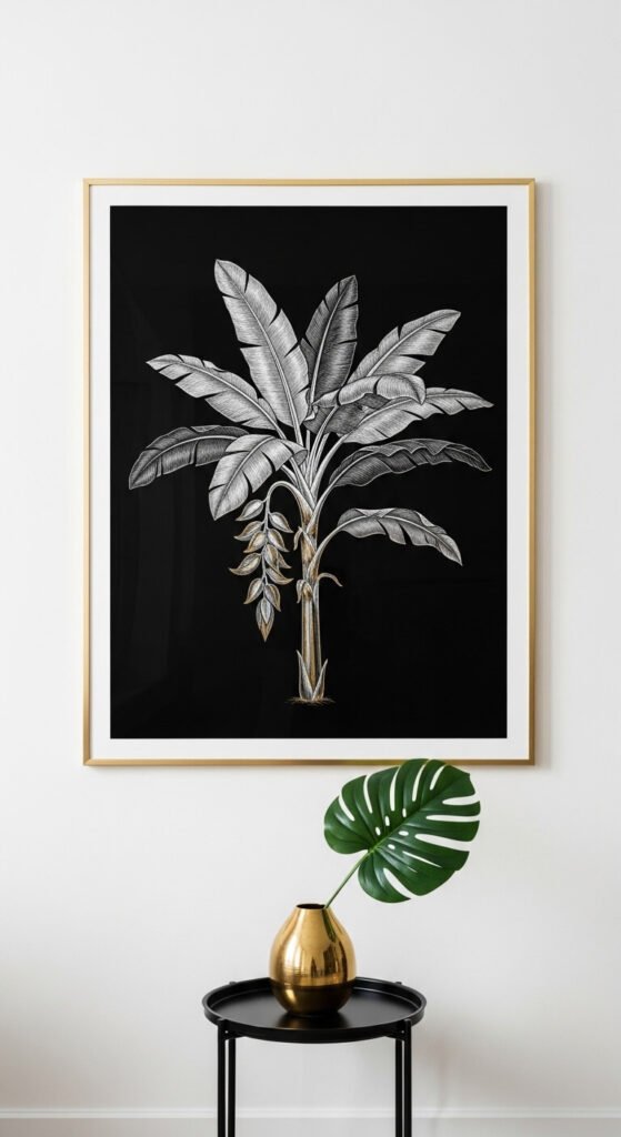 Go big or go home with tropical leaf prints. Oversized monstera, banana leaf, and bird-of-paradise illustrations make incredible statement pieces. A single large print can anchor an entire wall. Print a digital file at 16×20 or 18×24 inches for serious visual impact. Pair the print with an actual tropical plant nearby to blur the line between art and nature. This combo works especially well on terracotta, sage green, or charcoal walls.
