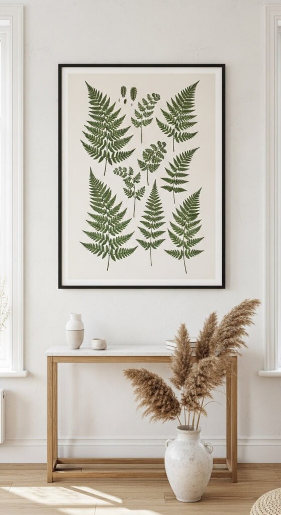Ferns are the most recognizable botanical subject — and they never go out of style. Look for prints with detailed frond illustrations on aged cream or ivory paper. Black frames keep them sharp and modern. Gold frames lean more traditional. You can find high-quality fern prints on Etsy for under $10 as digital downloads. Print them at your local print shop on cardstock. Done. They work in bathrooms, hallways, and living rooms equally well.