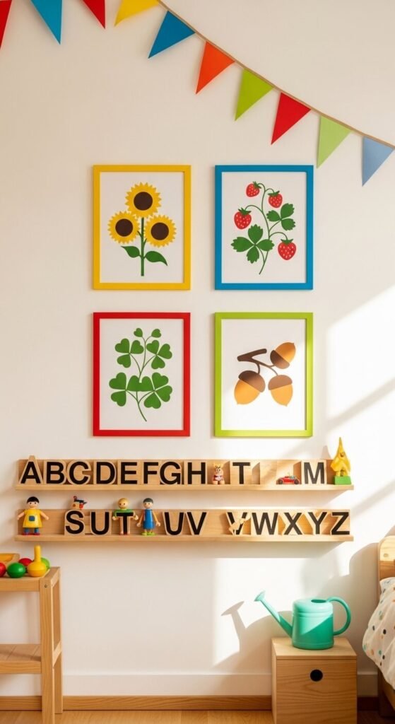 Botanical art isn’t just for grown-up spaces. Bold, simplified plant illustrations in bright, primary colors are perfect for children’s rooms and nurseries. Think: big sunflowers, strawberry plants, acorns, and mushrooms rendered in flat graphic style. These teach kids about nature while making the room look intentional and beautiful. Look for “kids botanical print” or “nursery plant art” on Etsy. You can often find sets of four or six matching prints as digital downloads for under $10.