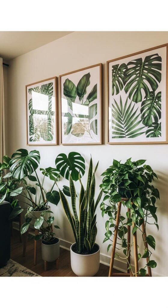 The most impactful botanical display combines printed art with real, living plants. Hang prints of the same plant species you’re actually growing in the space — a framed monstera print above a real monstera, for example. The printed art and the live plant create a layered, immersive effect that feels intentional and abundant. This is especially powerful in corners. It doesn’t require a lot of floor space, just thoughtful placement of both prints and pots.