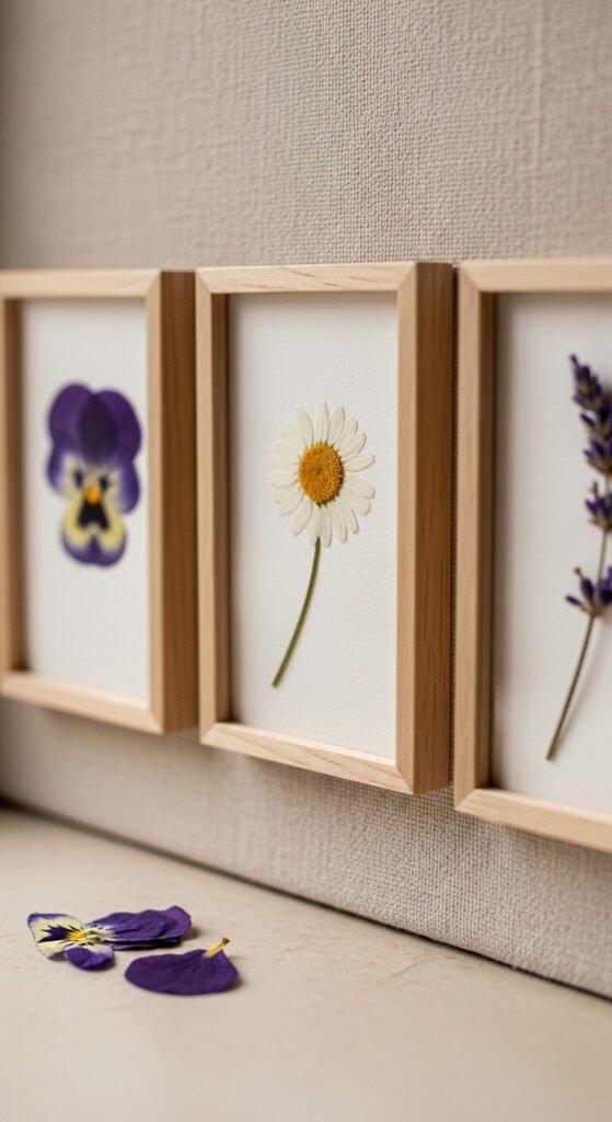 This is one of the most satisfying DIY projects you can do on a Sunday afternoon. Pick flowers from your garden or grab a grocery store bouquet. Press them flat between heavy books for two weeks. Then mount them on thick white paper and frame them. Matching frames in a set of three or five look intentional and polished. Total cost? Under $15. These make incredibly personal wall art — and no two are ever exactly alike.