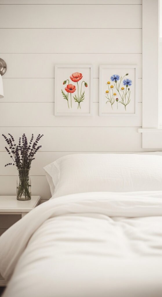 Wildflower prints bring that carefree, garden-cottage energy into any room. Look for loose watercolor-style illustrations rather than stiff scientific drawings — they feel more relaxed and organic. Poppies, cornflowers, lavender, and chamomile are especially popular. These work beautifully in bedrooms and reading nooks. Bundle three or four small prints together in matching white frames for a gallery cluster above a nightstand or dresser.