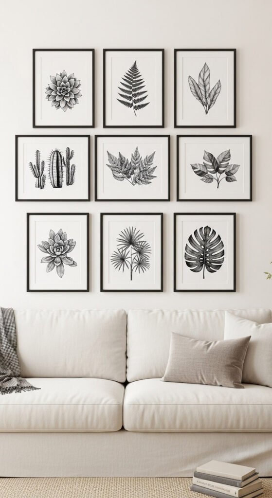A grid gallery wall is one of the most satisfying decorating moves you can make. Pick nine to twelve botanical prints in the same style — all black ink, all white backgrounds works perfectly. Frame them identically. Space them evenly. The repetition creates a clean, almost museum-like effect that feels expensive. Use a piece of kraft paper cut to frame size to plan your layout on the wall before you hammer a single nail.