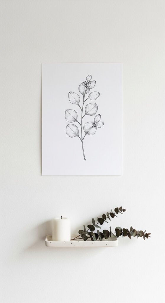 Eucalyptus prints are the definition of quiet, understated elegance. A single branch illustration on white paper in a slim frame is all you need. This is ideal for minimalist or Scandinavian-style spaces where less is genuinely more. Download a free eucalyptus line drawing, print it in black ink, and frame it. Total cost under $5 if you already have a spare frame. Hang one above a bathroom mirror or on a narrow kitchen wall for an instant refresh.
