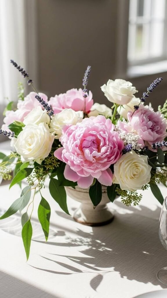 Raid your cupboard or visit thrift stores for vintage teacups. Place small bunches of violets, pansies, or miniature roses in each cup. Line them down the table or cluster at the center. This charming setup works beautifully for tea parties or Mother’s Day brunches.
