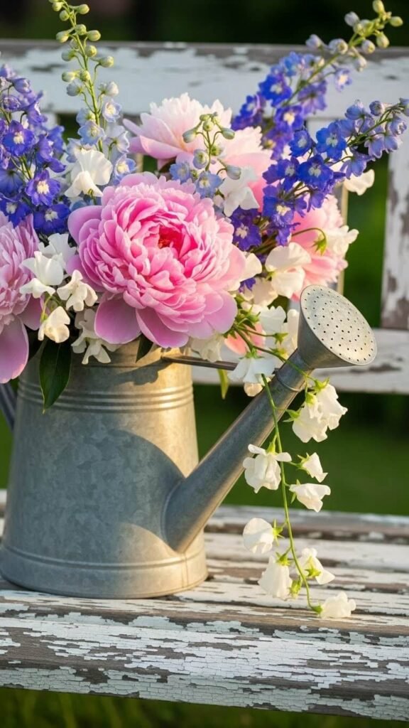 Pull out that old watering can from the garage or shed. Fill it with a big, loose arrangement of peonies, delphiniums, or whatever’s in season. Let stems spill over the spout for a garden-gathered look. This works perfectly for outdoor dining or farmhouse-style tables.