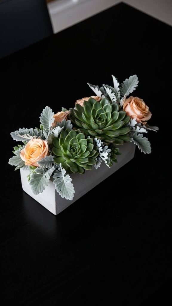 Mix succulents with cut flowers in a shallow planter. The succulents provide structure while flowers add softness and color. Use roses, carnations, or spray roses paired with echeveria or sedum varieties. This modern combo lasts longer than flowers alone.