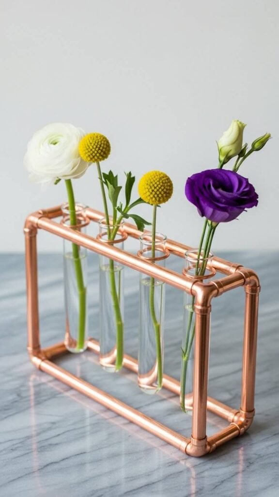 Create a modern holder using copper pipes from the hardware store. Cut pipes to different heights and connect with elbow joints. Insert glass test tubes or small vases into pipe openings. Add single stems to each tube for a minimalist, geometric look.