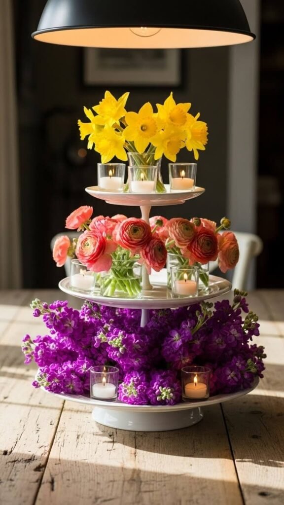 Use a tiered cake stand for flowers instead of desserts. Place small vases or jars at each level. Fill with different flower types or colors per tier. This vertical approach saves table space while creating height and drama.