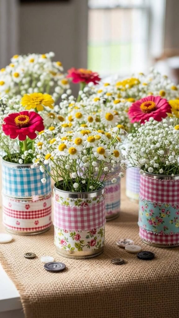 This project uses materials you’d normally throw away or have in craft bins. Each can holds 3-5 flower stems. Choose fabrics that match your color scheme. Add ribbon or twine around the rim for polish. The casual, handmade vibe works for relaxed gatherings. Kids can help wrap cans while you arrange flowers.