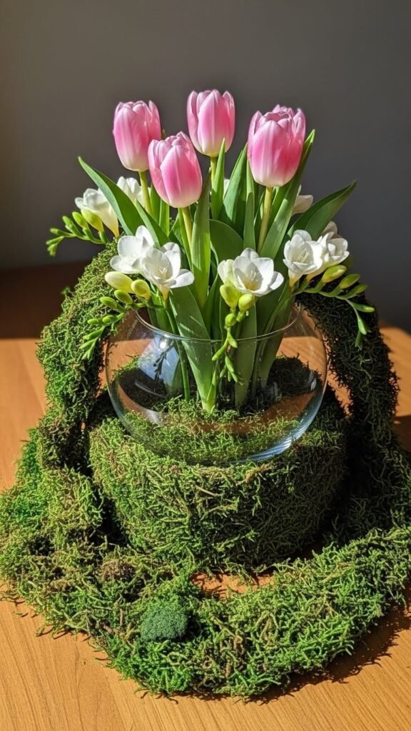 Cover your vase base with sheet moss from the craft store. Wrap moss around the container and secure with fishing line or thin wire. The natural covering hides ordinary vases and adds organic texture. Pair with simple spring blooms for a garden-inspired look.
