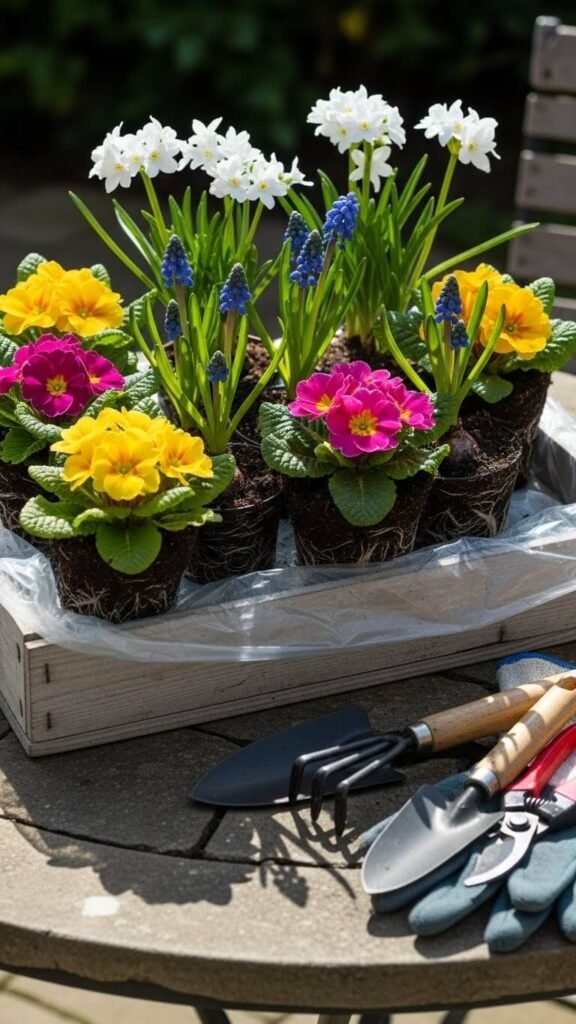 Wooden boxes cost $10-15 at craft stores or use fruit crates from grocery stores. Small plants run $2-4 each. This living arrangement beats cut flowers for longevity. After blooms fade, transplant to your garden. The box becomes garden storage or holds future arrangements.
