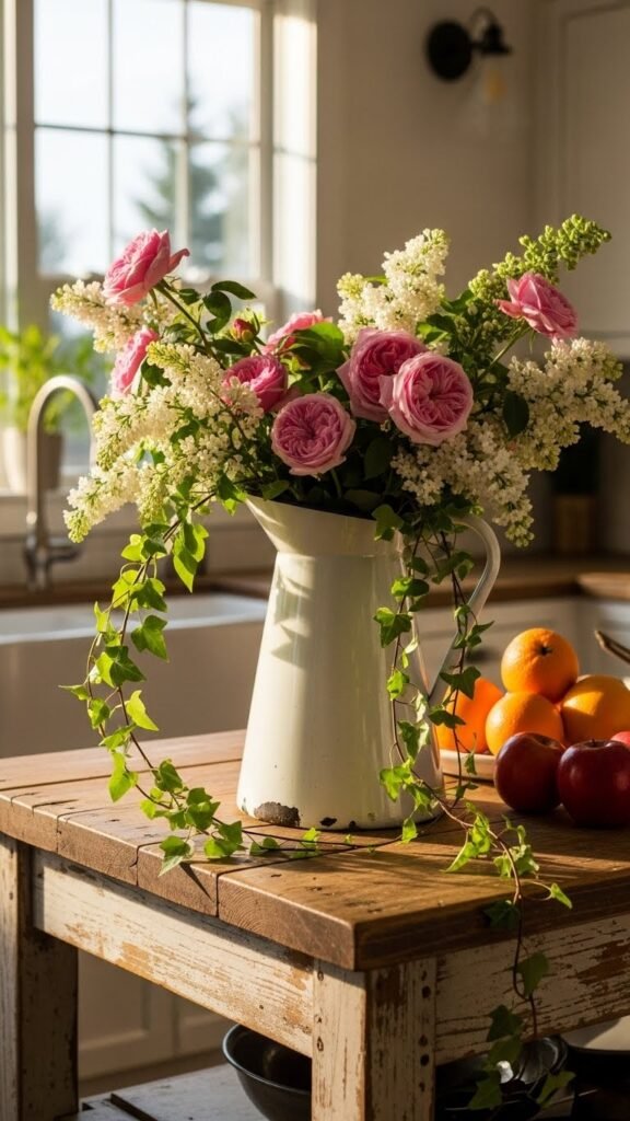 Use a kitchen pitcher as your vase. Fill it generously with a loose, garden-picked style arrangement. Let stems fall naturally over the edges. Lilacs, roses, and flowering branches work beautifully. This approach feels abundant without being precious.