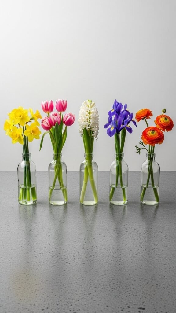 Buy five matching bottles at dollar stores for $5 total. Grocery store flowers come in bunches by color—buy one bunch per bottle. This technique turns simple materials into designer-looking décor. The clean lines photograph beautifully. Adjust the number of bottles to your table length.