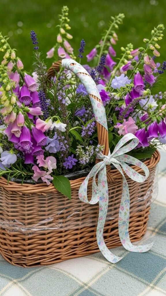 Most homes have baskets that can double as vase holders. Poke small drainage holes in plastic if using potted plants instead of cut flowers. The natural basket pairs beautifully with garden flowers. After the event, remove plastic and return basket to storage. This versatile container works for bread, fruit, or future arrangements.