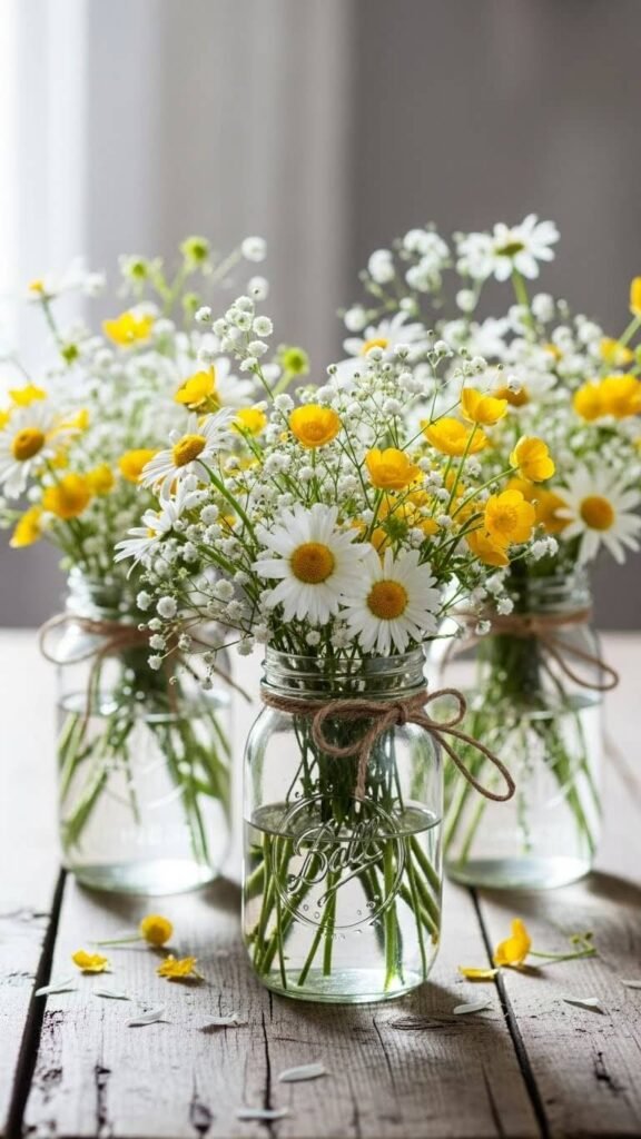 Buy a $6 mixed bouquet from the grocery store. Separate stems by type. The varying heights create visual interest without blocking conversation. Wrap jars with twine or ribbon for extra texture. Change water every two days to keep blooms perky. This approach costs under $10 and takes 15 minutes to arrange.