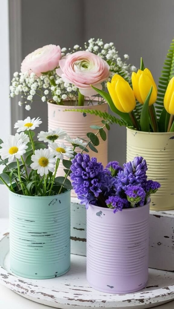 Paint clean tin cans in spring pastels. Use spray paint for quick coverage. Let dry completely before adding water and flowers. Group cans in different sizes for visual interest. The custom colors tie your table together.