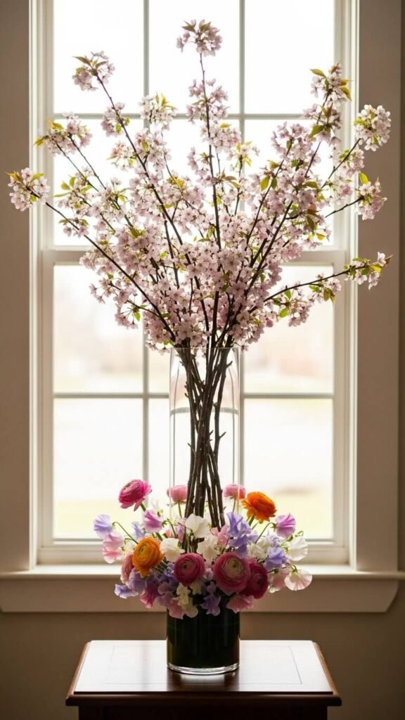 Start with flowering branches—cherry blossoms, forsythia, or quince. Anchor them in a tall vase. Add shorter cut flowers at the base. The vertical branches create height while blooms add fullness. This Japanese-inspired style brings spring indoors beautifully.