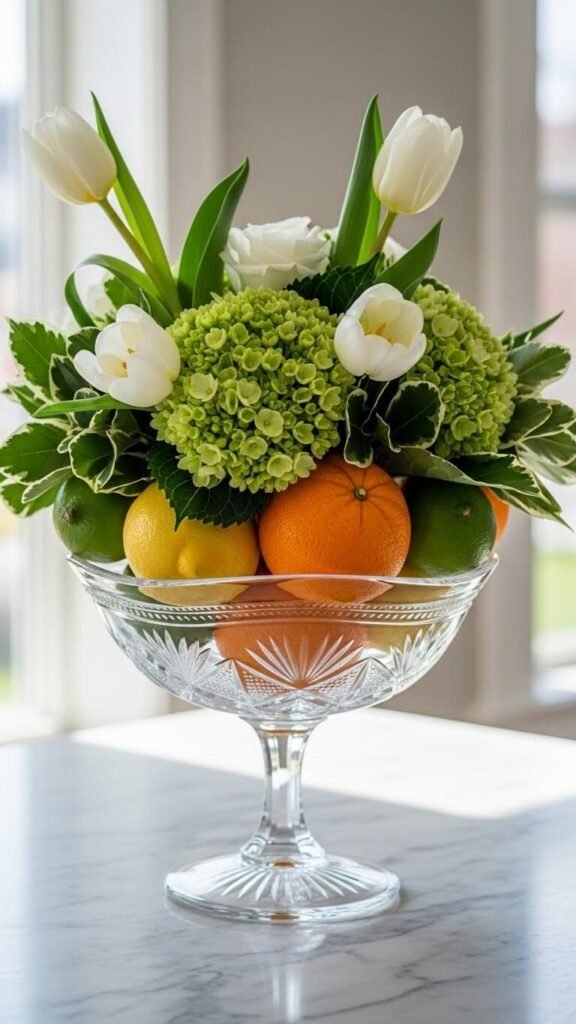 Layer fresh fruit in the bottom of a clear compote or pedestal bowl. Top with a flower arrangement that echoes the fruit colors. The visible fruit adds unexpected detail and extends the spring theme. This works beautifully for brunch or spring celebrations.