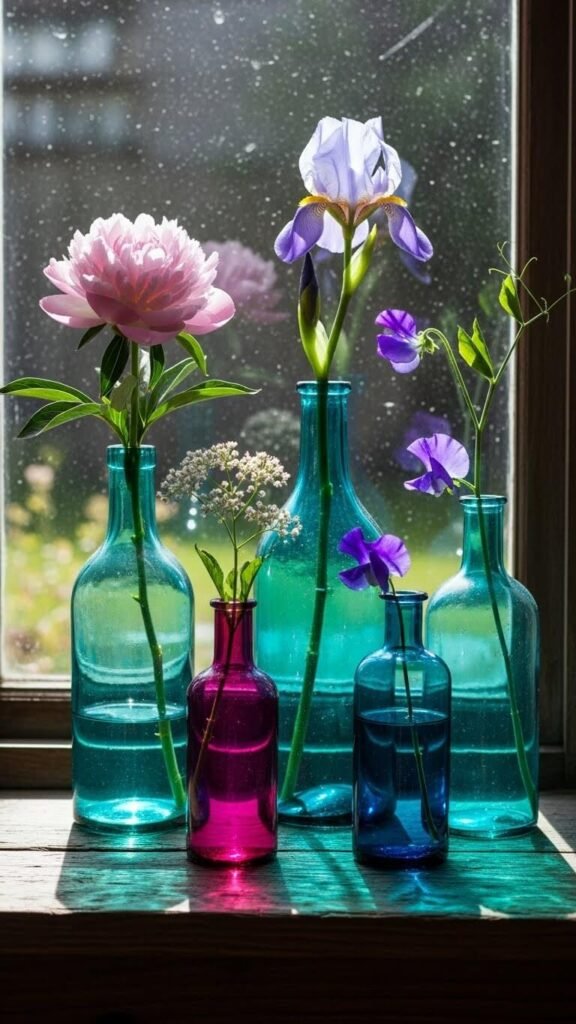 Flea market bottles cost $2-5 each and become permanent décor pieces. This collection grows over time as you find special bottles. The imperfect glass catches light beautifully. No two arrangements look exactly the same. After flowers fade, bottles become kitchen décor or hold single blooms year-round.