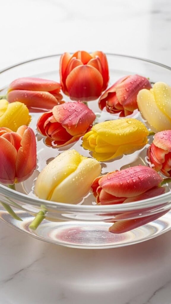 Find a wide, shallow bowl in your kitchen. Fill it halfway with water. Cut tulip heads short, leaving about an inch of stem. Float them face-up in the water. The blooms stay hydrated while creating a modern, minimalist look.