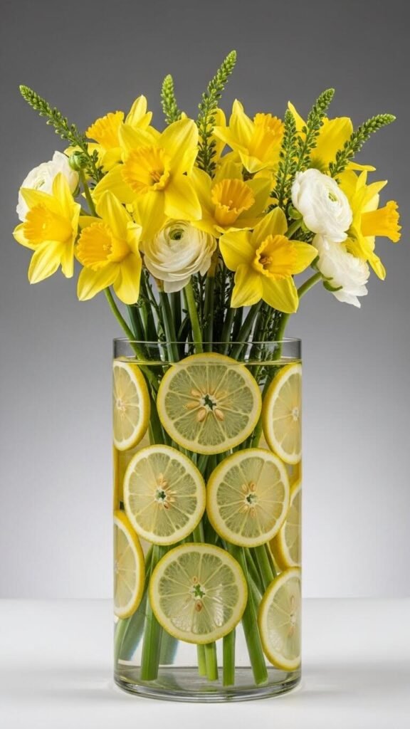 This trick makes simple supermarket flowers look expensive. Use daffodils, tulips, or any spring blooms. The citrus costs about $2 and lasts as long as the flowers. Change water every other day to prevent cloudiness. The visual effect photographs beautifully for social media sharing. Remove fruit before composting or tossing flowers.