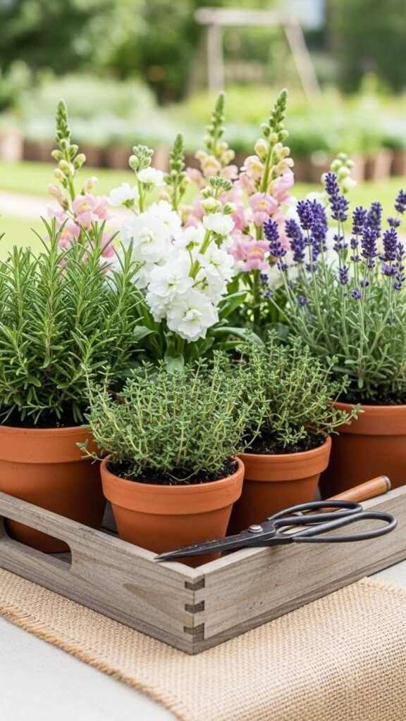 Combine fresh herbs with flowers for a fragrant, functional centerpiece. Plant rosemary, thyme, or basil in small pots. Tuck cut flowers like stock or snapdragons between the herbs. Guests can pinch herbs for their meals while enjoying the floral beauty.
