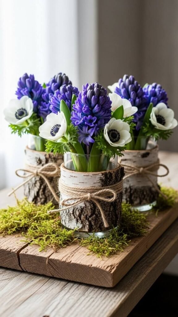 Wrap plain glass vases or cylinders with birch bark sheets. Secure with twine or raffia. Fill with spring blooms like hyacinths, anemones, or ranunculus. The organic texture brings outdoor elements inside while hiding plain containers.