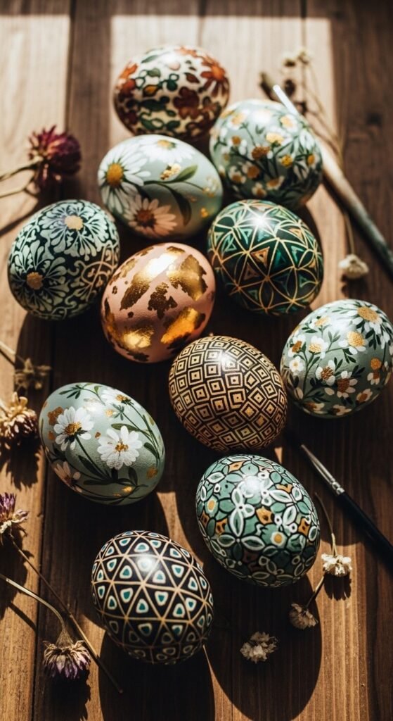 Use a fine liner brush and gold acrylic paint to paint a small zodiac symbol or constellation on each egg. You don’t need to freehand it — print reference images and use them as guides. Paint your family’s signs and use the eggs as personalized place cards. Dark-dyed base eggs in burgundy or forest green make the gold detail pop beautifully. These feel personal and thoughtful without taking a lot of time.