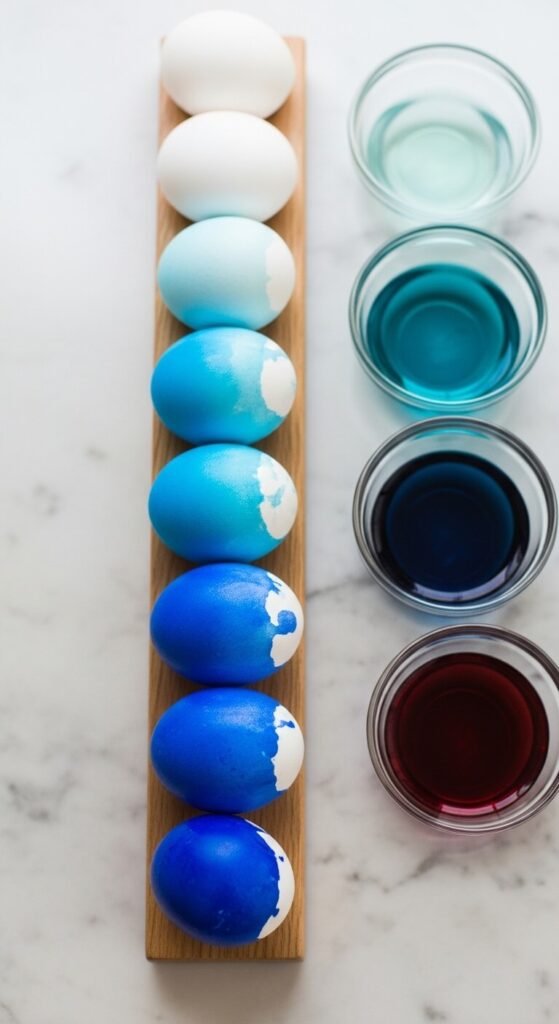 For an ombre egg, dip just the bottom third of your egg in dye. Wait two minutes. Dip it slightly deeper. Wait again. Keep going until the whole egg is submerged. The longer sections stay in the dye, the darker and more saturated they become. Pull the egg out slowly for a smooth gradient. This looks very polished for minimal effort. Works especially well with bold single colors like cobalt, emerald, or fuchsia.