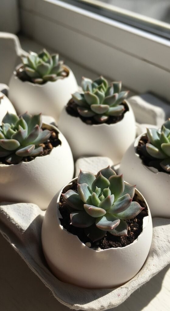Carefully crack the top off a raw egg and empty the contents. Rinse the shell and let it dry. Fill the shell with a small pinch of potting soil and plant a tiny succulent cutting or small moss clump inside. Set the egg in the original carton to hold it upright. These look amazing as table centerpieces. Succulents are incredibly affordable at hardware stores — one $3 plant can be divided into many small cuttings.