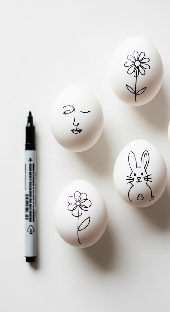 Grab a fine-tip permanent marker and draw a single unbroken line across the egg to create a simple image — a face, a bunny, a floral sprig. The “one line” art style is forgiving because imperfection is part of the aesthetic. Plan your design loosely first on paper. Simple, abstract, and fast. These look incredibly chic displayed in a white bowl. Zero supplies needed beyond a marker you already own.