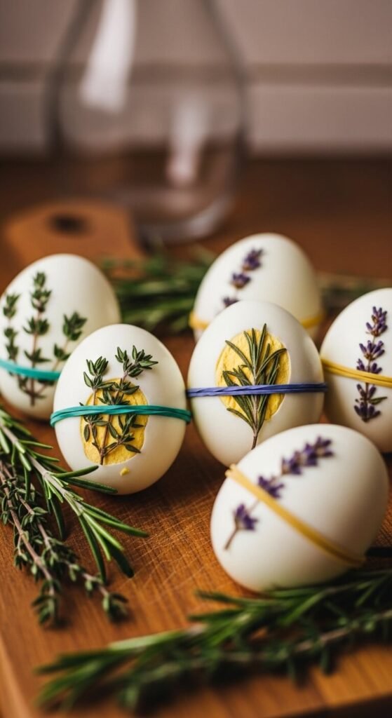 Place a sprig of fresh herb (thyme, fern, or parsley works well) flat against a raw egg. Wrap the egg tightly in a thin piece of nylon stocking and tie it off. Drop it in onion skin dye or standard dye. The herb blocks the dye and leaves a perfect silhouette of the plant on the shell. Remove the stocking after dyeing and peeling back the herb reveals a beautiful natural print.