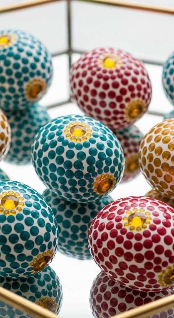 Buy a pack of small round office dot stickers or gem stickers from the dollar store. Place them one by one across the surface of the egg in any pattern — stripes, sunbursts, concentric rings, or totally random. Press each one flat. Cover the entire egg surface or leave white space between for a more minimal look. This is a no-mess, no-skill craft that even very young kids can do. A pack of stickers costs $1–2 and covers a dozen eggs.