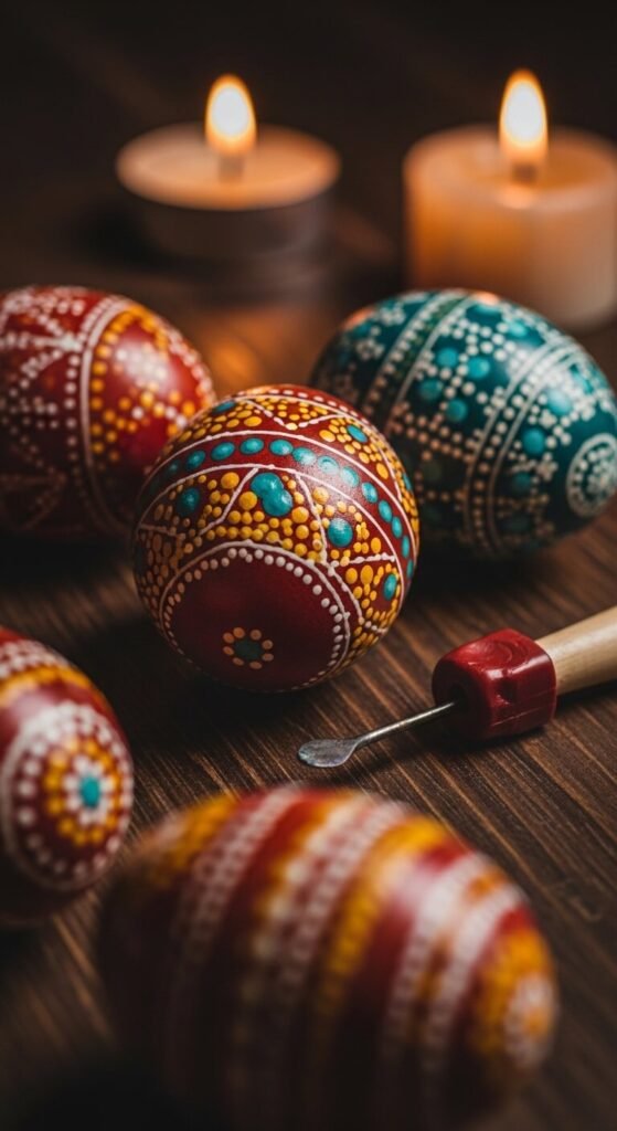 This is an advanced version of the crayon wax resist method. Melt beeswax in a small metal spoon over a candle. Dip a toothpick or small stylus into the wax and draw dots, lines, and patterns on the egg quickly before the wax cools. Dye the egg, then melt the wax off near a candle flame. Repeat with different dye colors for layered results. This traditional Ukrainian pysanka technique is time-consuming but produces genuinely stunning eggs.