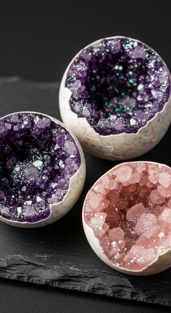 Crack open a blown egg shell along the middle, creating two halves. Mix clear epoxy resin with a small amount of glitter, crushed glass beads, or colored pigment. Pour it into the shell halves and let it cure for 24 hours. Add extra crystal pieces on top before it fully sets. The finished result looks like a split geode rock. Display them open-face on a shelf. Resin kits start around $12 and can fill many egg halves from one batch.