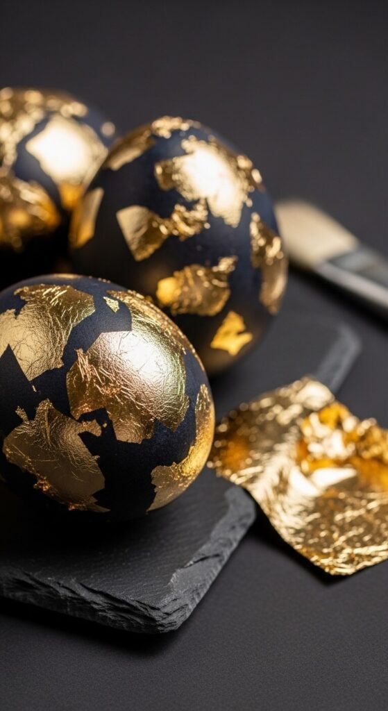 Paint your egg with black or navy acrylic paint first. Let it dry completely. Then apply a thin layer of craft glue to sections of the egg and press on gold leaf sheets. The leaf will crack and break naturally, giving a dramatic crackled effect. It looks expensive but costs almost nothing. Imitation gold leaf packs are available for about $5 and contain dozens of sheets. One pack makes many eggs.