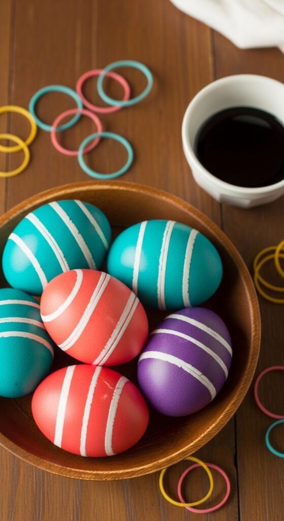 Wrap rubber bands tightly around an egg in any pattern before dipping it in dye. The bands block the dye and leave clean white lines where they were. Try wrapping bands in parallel lines, Xs, or random criss-cross patterns. Remove bands after drying to reveal the design. Layer two dye colors for more complex results. This technique works with standard egg dye kits — no extra supplies needed.